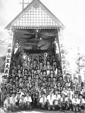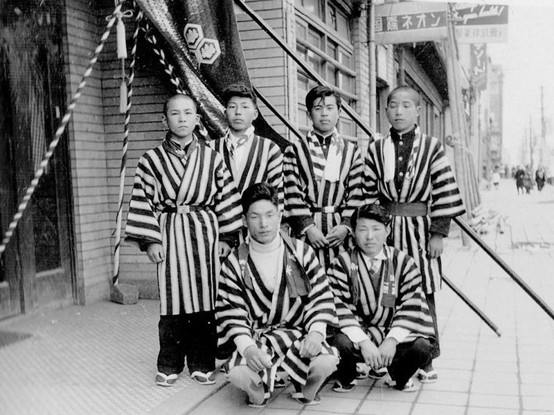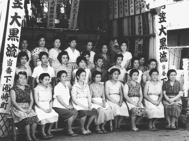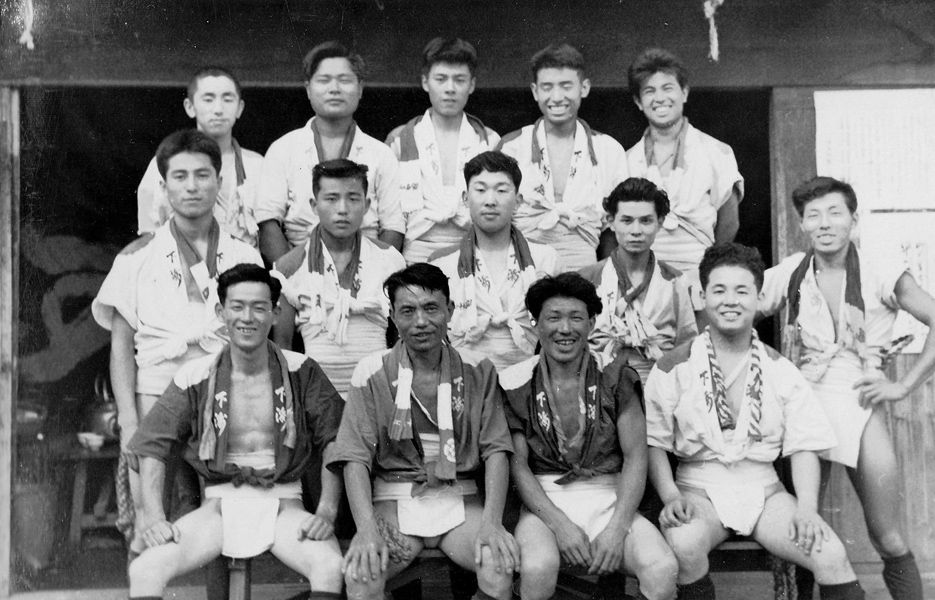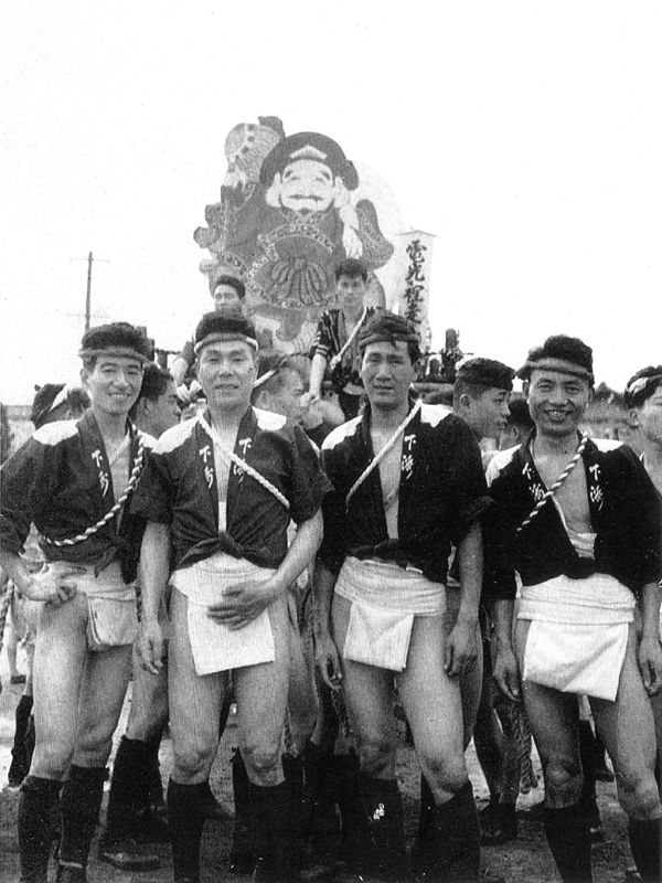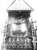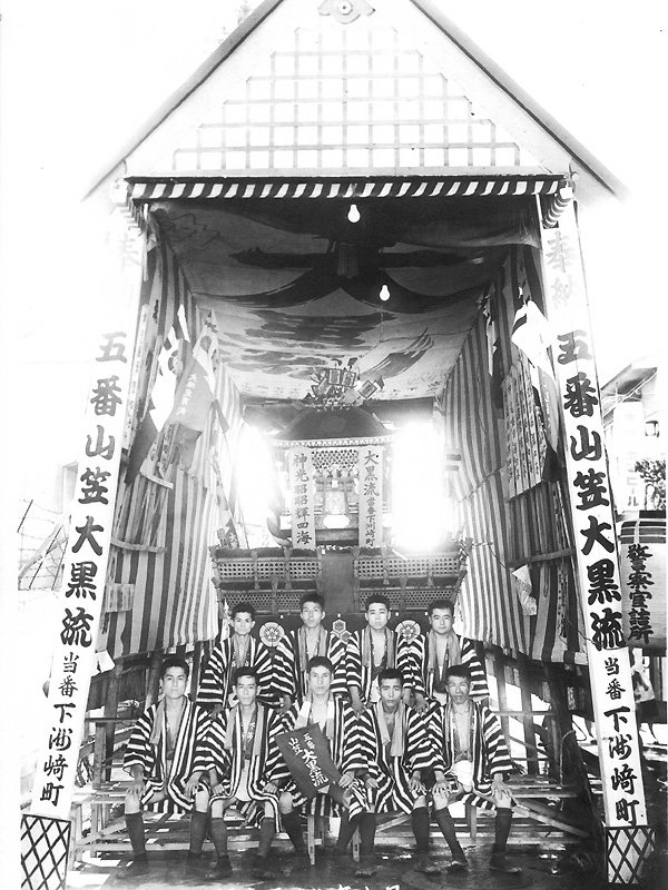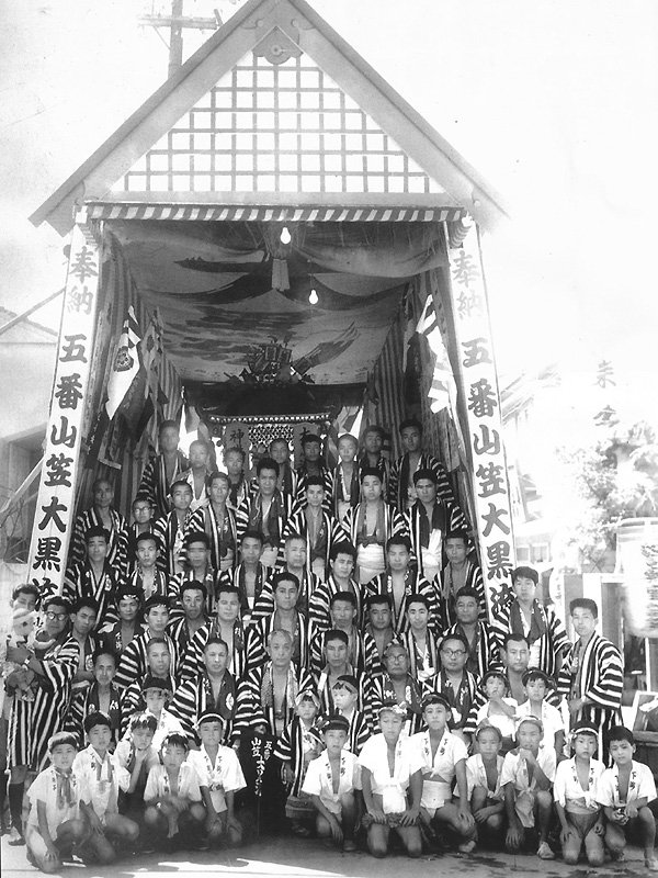 その間、昭和19年に戦前戦中最後の山笠当番をつとめます。翌20年6月19日の福岡大空襲で全町壊滅し、戦後の区画整理で昔の面影はなくなってしまうのですが、この年、昭和19年には映画「陸軍」の撮影のため9月にもう一度ヤマを建て撮影に協力しており、劇中、山笠が下洲崎町を舁き廻る姿が残されています。