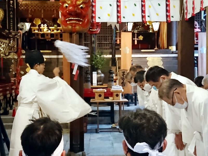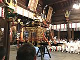 雨天のため櫛田神社拝殿で行われた神輿清め(22日)
