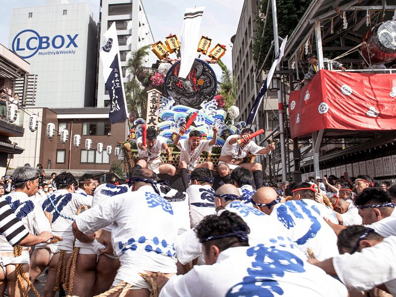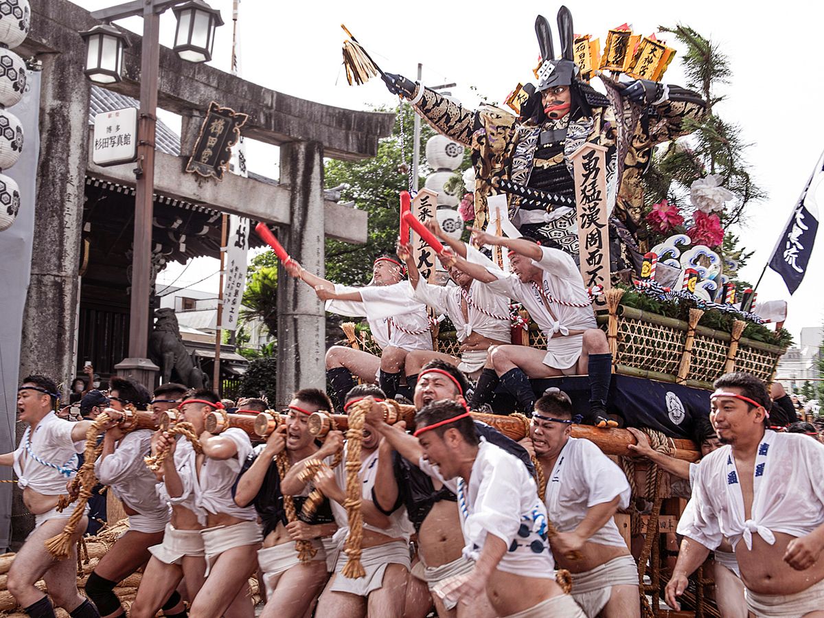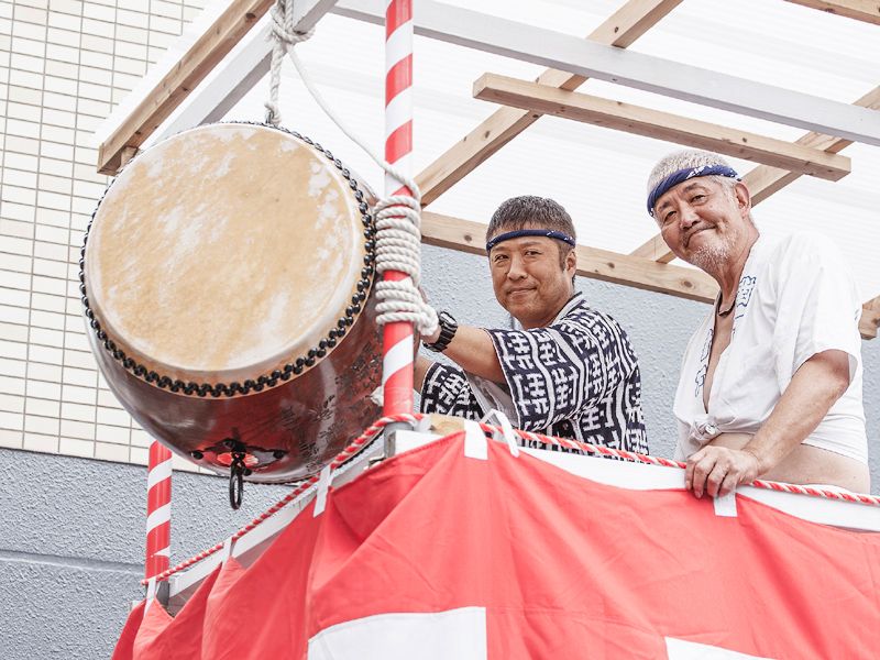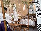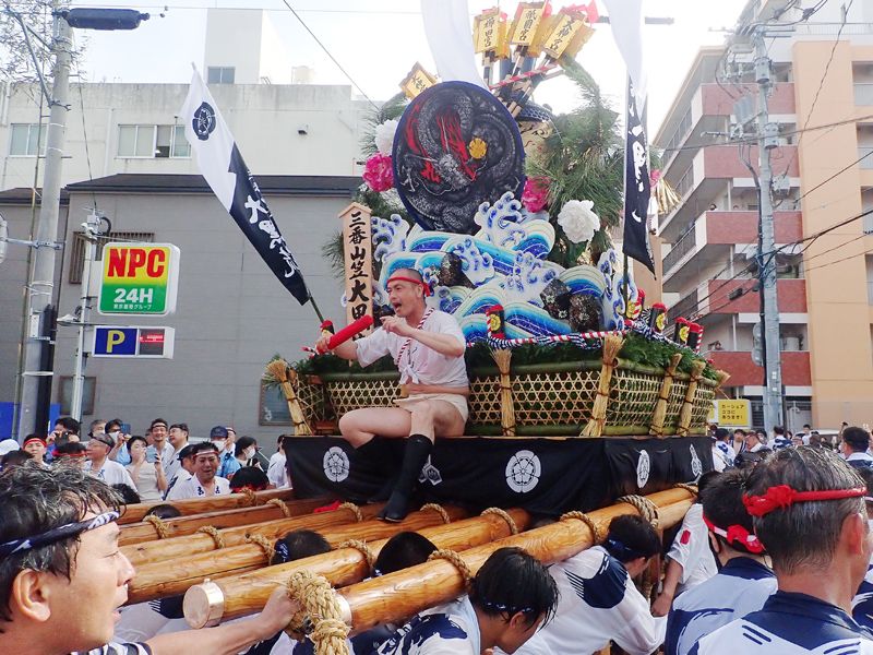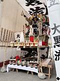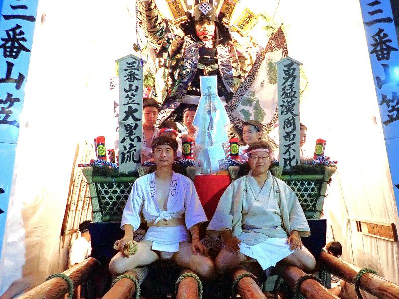 棒〆後、山台と舁棒に抗菌処理を施す。(山笠振興会の斡旋)