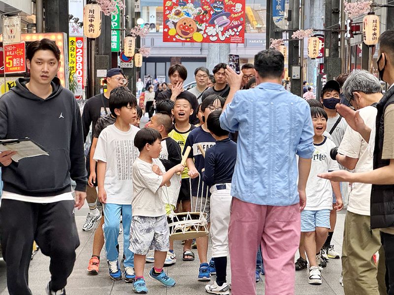 五月晴れの中、博多松囃子が賑やかに催行されました。参加された皆様、また、今期で退任される博多松囃子振興会 楢ア尚弘会長(つノ一)、大変お疲れ様でした。(写真:4日 櫛田神社を出発する大黒天)