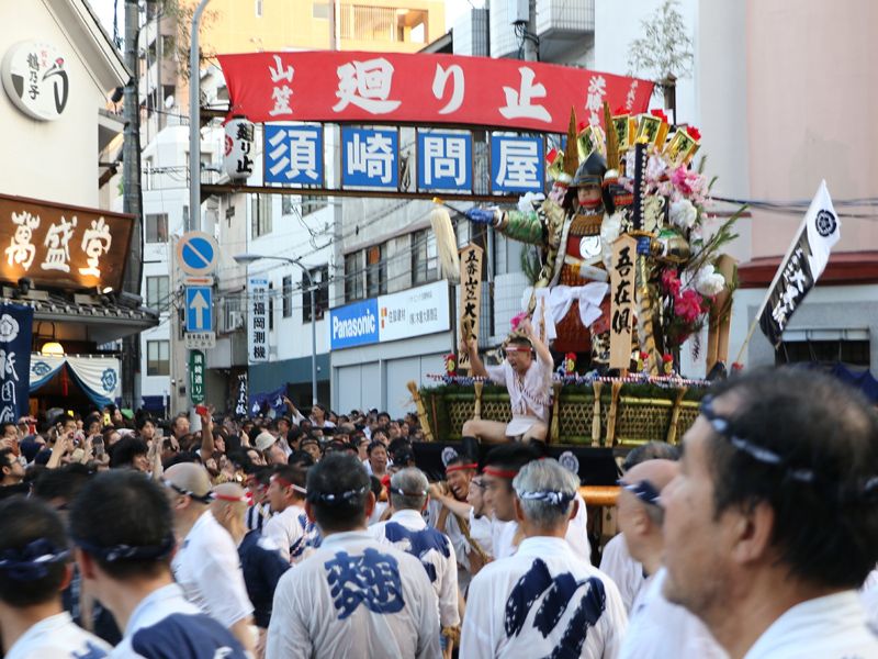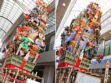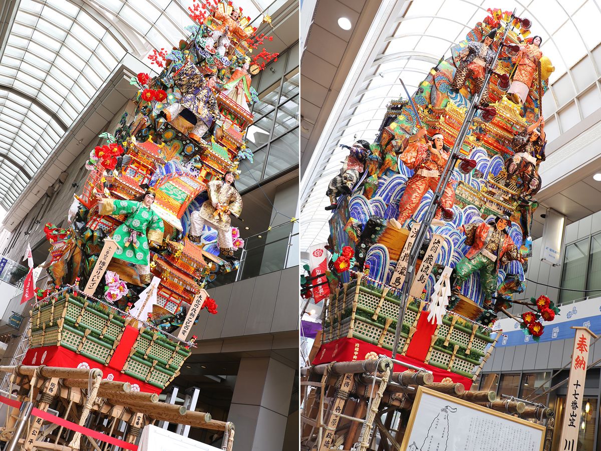 市内の飾り山笠が公開される7月1日、大黒流内に建つ十一番山笠 博多リバレインと十七番山笠 川端中央街も、御神入れの神事を経て公開されました。博多リバレインは従来の明治通り沿いから鏡天満宮そばのアーケード内に場所を移しています。