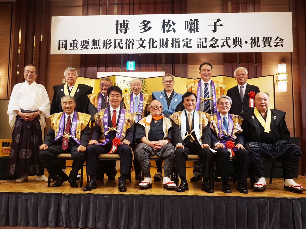 恒例の大黒流昭和会夏季懇親会が櫛田神社で開催されました。来賓として櫛田神社阿部宮司、博多中学校の堀澤校長、福田教頭、博多小学校の浦川校長、大道教頭にご出席いただき、今年も大いに賑わいました。(写真:当番町つノ二の皆さん) (祝い目出度の唱和)