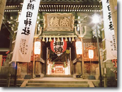 博多祇園山笠は博多の総鎮守・櫛田神社の祭礼で、神社にお祀りする素盞鳴命(祇園大神)への奉納行事です。大黒流など七流は、それぞれに舁山(かきやま)を建て、勢い水を浴びながら博多の街を疾走します。全国33の祭りとともにユネスコ無形文化遺産に登録されています。